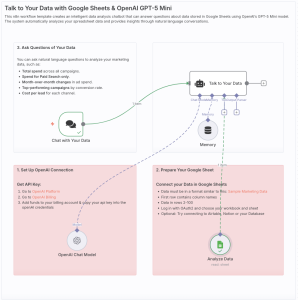 “Talk to Your Data” là workflow n8n biến Google Sheets thành một “chuyên viên phân tích” hồi đáp câu hỏi tự nhiên bằng mô hình OpenAI GPT‑5 Mini, cho phép phân tích số liệu mà không cần viết công thức hay lọc thủ công. Hệ thống đọc dữ liệu bảng tính, hiểu ý định truy vấn, và trả lời bằng insight rõ ràng theo ngữ cảnh hội thoại. Workflow còn hỗ trợ truy vấn nối tiếp nhờ Memory node để giữ ngữ cảnh phiên hỏi đáp.
