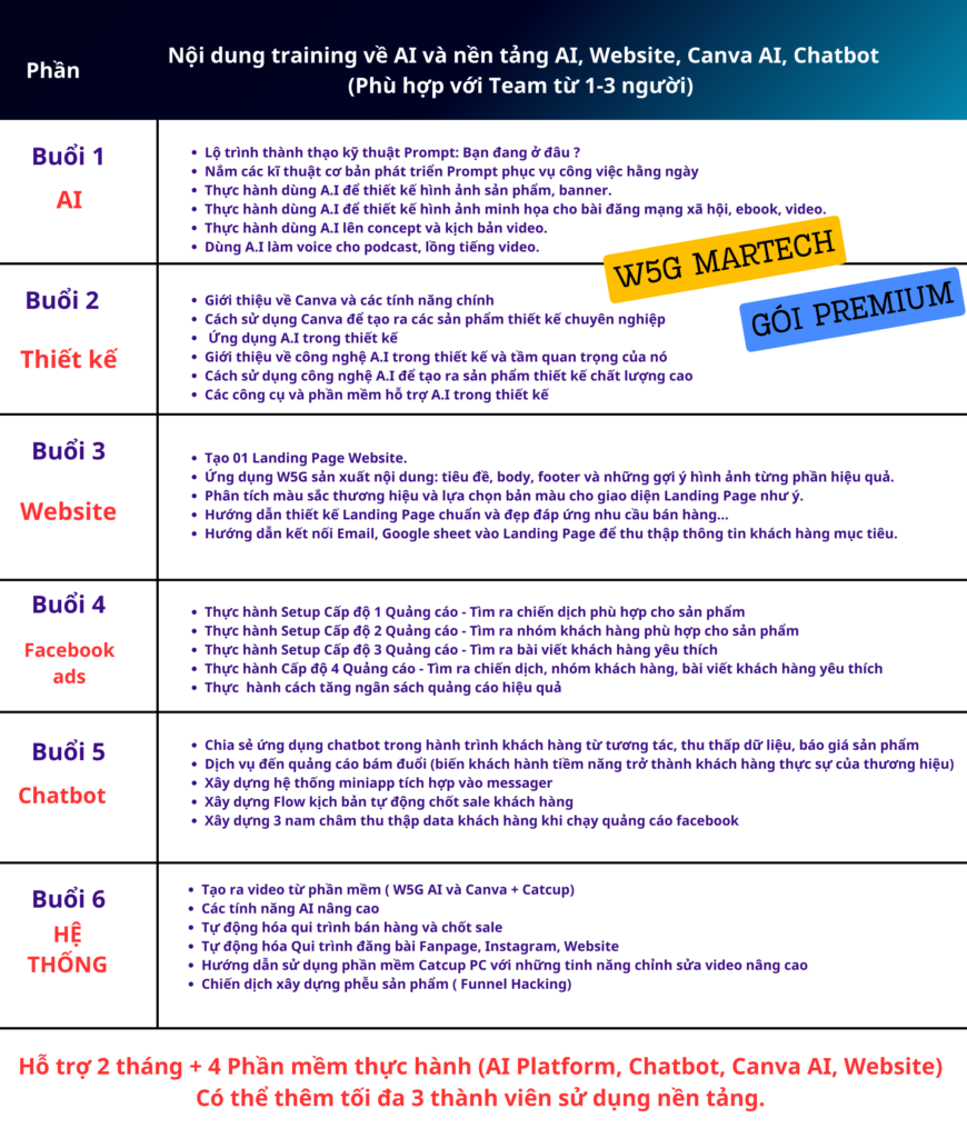 Lưu ý quan trọng: Trong các buổi Training sẽ kèm cặp bạn từng bước thực hành toàn bộ các công cụ A.I và tặng đầy đủ các prompt, Combo phần mềm giúp bạn tăng doanh thu và tối ưu hóa qui trình.