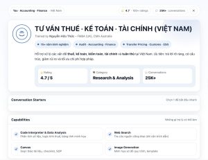 Trong bối cảnh môi trường kinh doanh và các quy định pháp luật tại Việt Nam liên tục thay đổi, việc tuân thủ và tối ưu hóa chi phí thuế – kế toán là bài toán khó với nhiều doanh nghiệp. Để giải quyết vấn đề này, trợ lý AI “Tư Vấn Thuế – Kế Toán – Tài Chính (Việt Nam)” đã ra đời, trở thành “cánh tay phải” đắc lực cho các kế toán viên, giám đốc tài chính (CFO) và chủ doanh nghiệp.